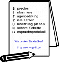 Kennen Sie das? Eine Sitzung wurde einberufen und die Teilnehmer versammeln sich im Besprechungsraum. Nun soll es losgehen, doch niemand hat eine Tagesordnung festgelegt. Ein Moderator, der die Sitzung leiten soll, wurde auch nicht bestimmt. Das Ende vom Lied ist eine Besprechung, bei der nur das Geld (Personalkosten) der Firma verbraucht wird, ohne dass konkrete Ergebnisse erarbeitet werden. Aus diesem Grund sollte vor jeder Sitzung ein Moderator (Sprecher) bestimmt werden, der sich um die organisatorischen Angelegenheiten wie Raum reservieren, Teilnehmer einladen, Tagesordnung verteilen usw. kümmern sollte. Alle Teilnehmer sollten pünktlich erscheinen oder ihre Abwesenheit dem Moderator frühzeitig mitteilen. Als erstes informiert der Moderator die Teilnehmer über den Gegenstand der Besprechung und stellt die Tagesordnung vor. Bestehen keine Einwände, so kann gestartet werden. Ein zuvor benannter Protokollführer hält alle Ergebnisse fest. Am Anfang müssen die Ziele festgelegt werden (siehe Ziele setzen leicht gemacht). Im Verlauf der Sitzung sollten die Umsetzung geplant und die nächsten Schritte vereinbart werden. Ist die Sitzung beendet, so fertigt der Protokollführer umgehend das Sitzungsprotokoll an und verteilt es an die Teilnehmer. Im Protokoll sind die nächsten Schritte jeweils mit Verantwortlichkeit und Terminierung festgehalten. Nur so kann eine Sitzung effizient sein! Als Denkanstoß kann man in jedem Besprechungsraum ein Blatt mit dem folgenden Inhalt aufhängen, das die wichtigsten Hinweise für effektive Sitzungen enthält: